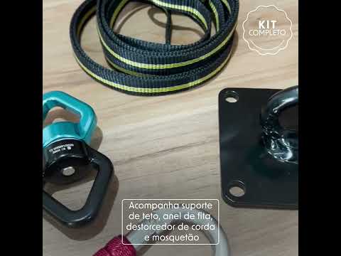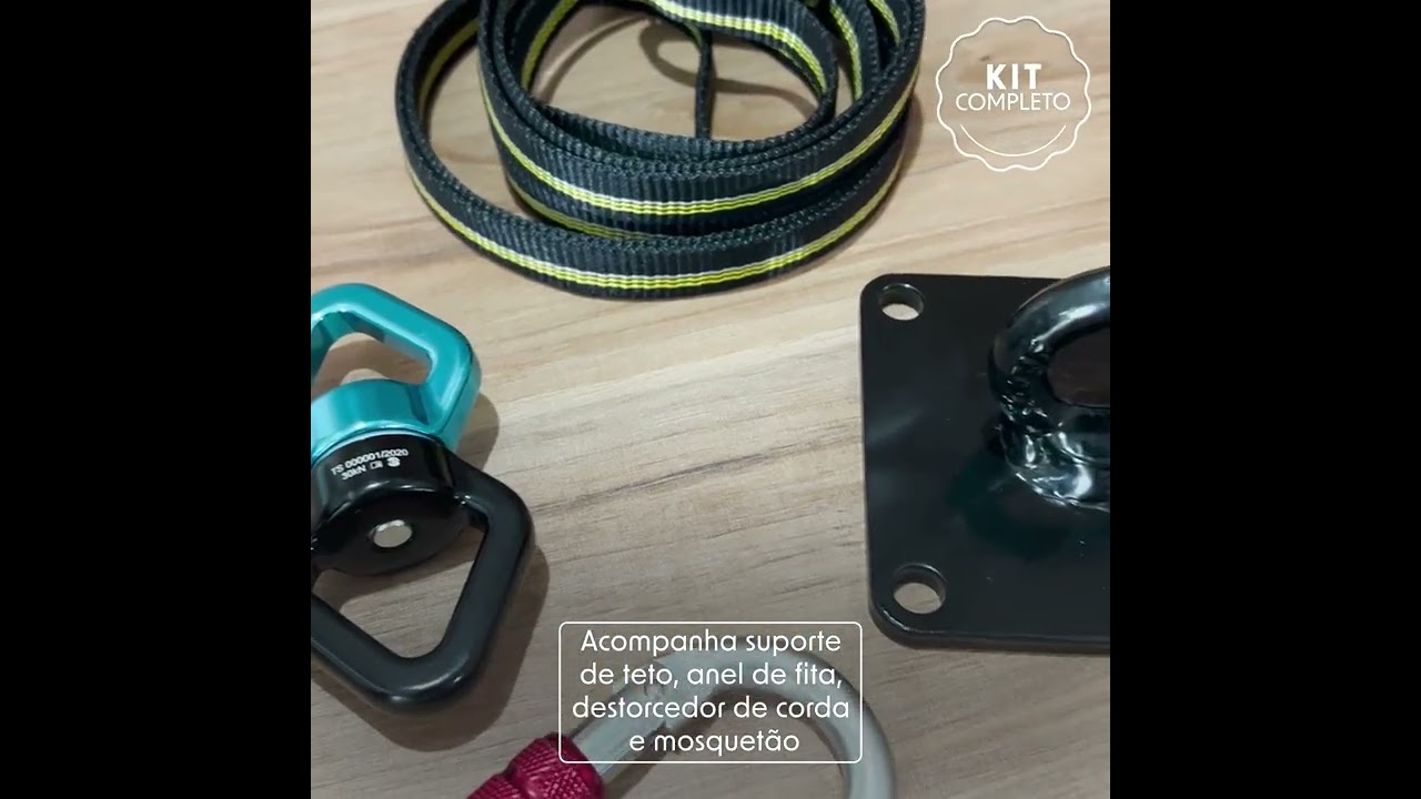 Para facilitar ainda mais a instalação da Lira, oferecemos a possibilidade de adquirir o Kit de Ancoragem (opcional). Este kit inclui todos os componentes necessários para a montagem segura da sua Lira. São eles: Suporte de Teto, Anel de Fita Poliamida, Destorcedor de Corda e um Mosquetão de Aço Oval. Com instruções detalhadas, garantimos um processo de instalação simples e rápido!