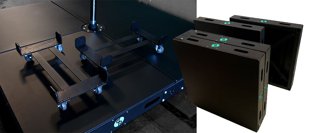 Palco se desmonta em 4 módulos que podem ser transportados individualmente ou em sistema de rodinhas.