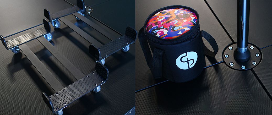 O palco, que possui uma montagem bem simples, acompanha um pole de aço inox com tecnologia Quick Lock, e ainda oferece a opção de adicionais como Lira Lollipop e Flying Pole.